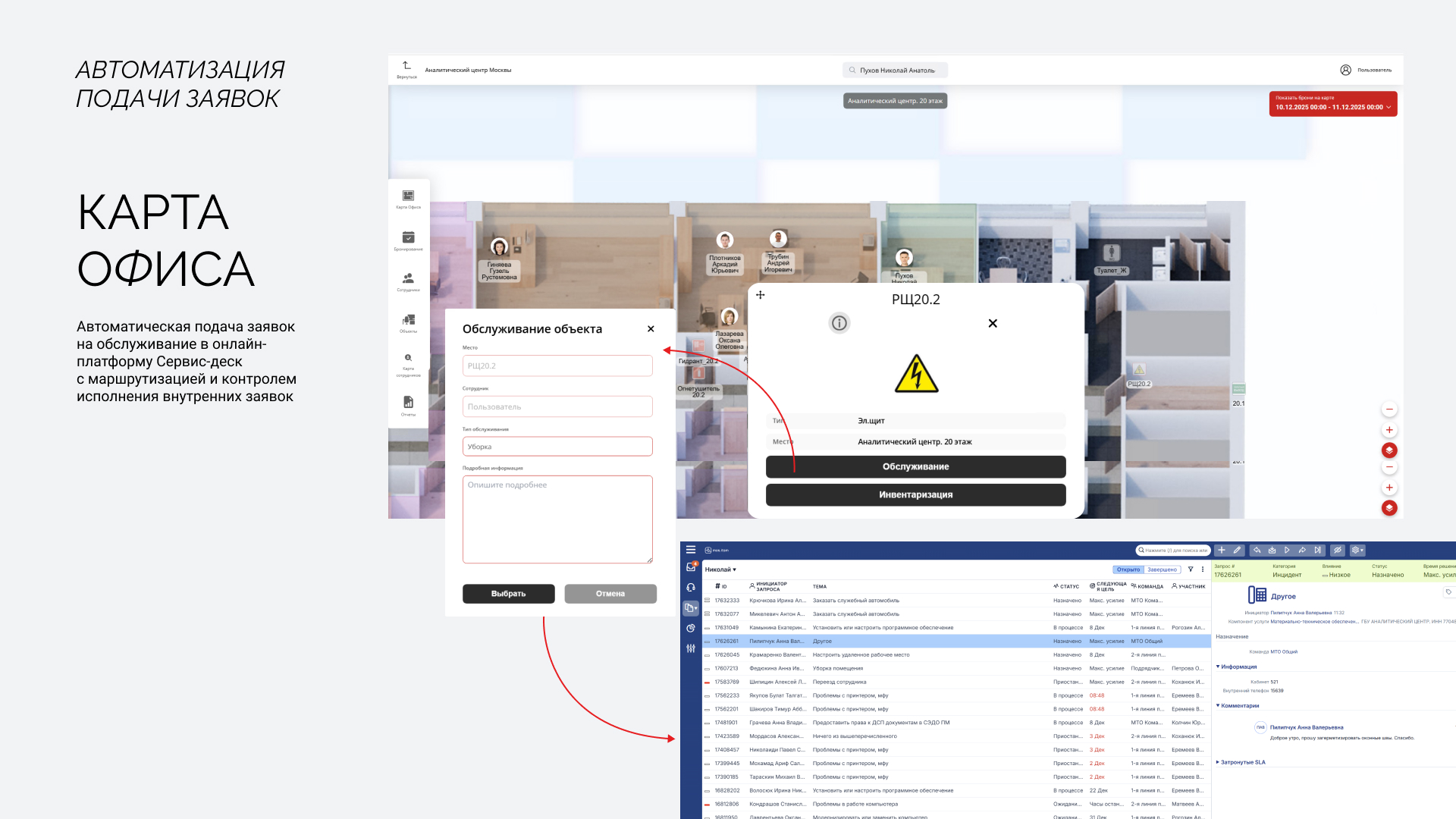Проект «Автоматизация внутренних процессов размещения, обеспечения и учета имущества сотрудников» охватил полный цикл обеспечения офисной среды и сотрудника: от выхода сотрудника в офис, его рассадки, выдачи и замены оборудования, выполнения заявок на обслуживание, осуществления переездов и получения обратной связи от сотрудника. Немаловажно, что информационный комплекс работает не только с текущей инфраструктурой, но и помогает в планировании и проектировании переездов, закупок и любых других изменений в офисной инфраструктуре.