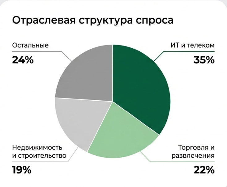 Основные покупатели гибкости — ИТ- и телеком-компании (35% сделок), торговые операторы и индустрия развлечений (22%), игроки рынка недвижимости и строительства (19%). Среди заметных арендаторов прошлого года — Sber Devices, Sitronics Group и Go Mobile.