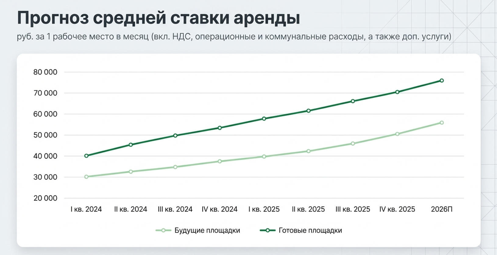 К концу года аналитики ожидают роста до 59 815 рублей для готовых площадок. Площадки, еще только готовящиеся к открытию, запрашивают и вовсе 75 634 рубля. Разрыв в 27% между готовыми и будущими площадками — это не просто ожидания операторов, но и прямое отражение возросших капитальных затрат: строить и отделывать стало принципиально дороже, чем три-четыре года назад.