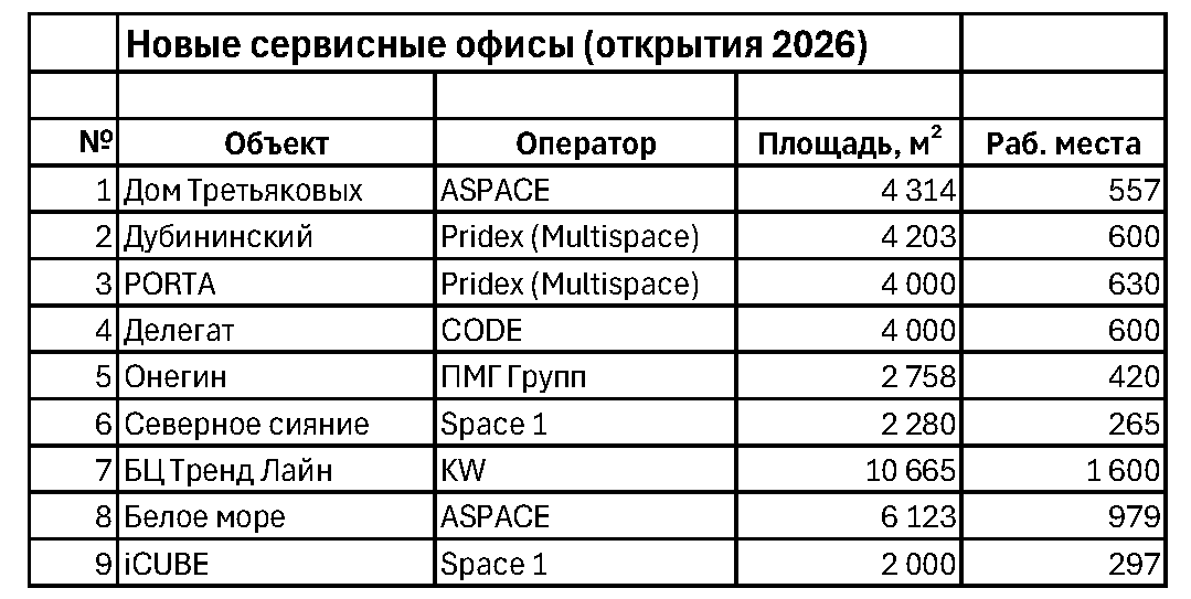 Крупные игроки, несмотря на рыночные ограничения, не останавливаются. В 2026 году анонсированы открытия Space 1, Aspace, Pridex (Multispace) и KW. Особого внимания заслуживает усиление формата «офис под конкретного корпоративного клиента». Это качественное изменение логики рынка: операторы все реже открываются «в надежде на спрос» и все чаще — под подписанный договор с якорным арендатором. Риски снижаются, но и свободного предложения становится меньше.