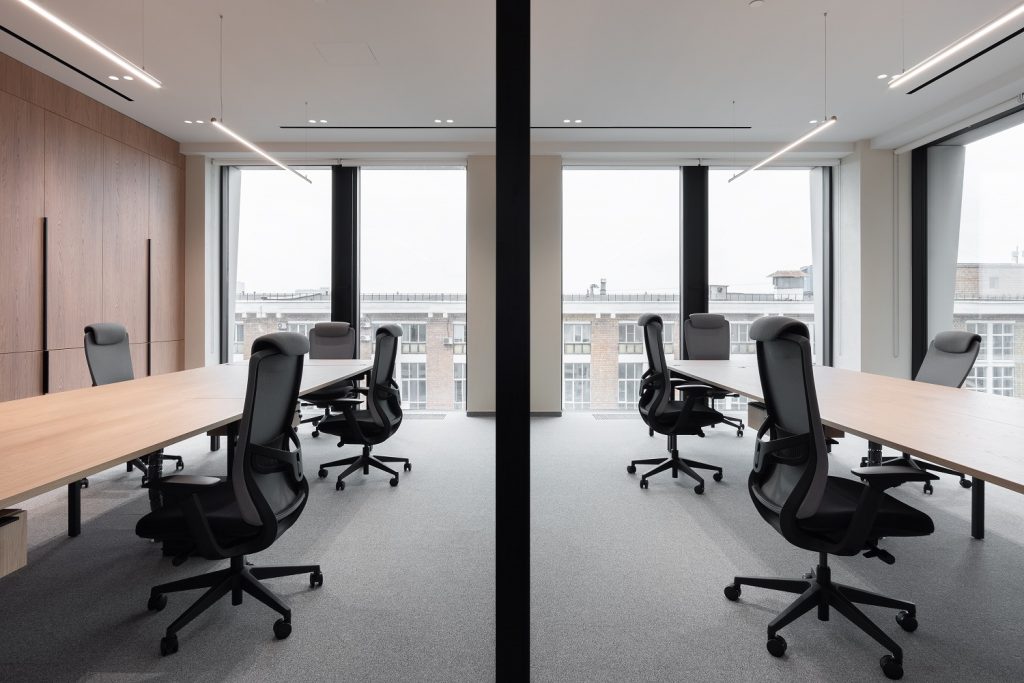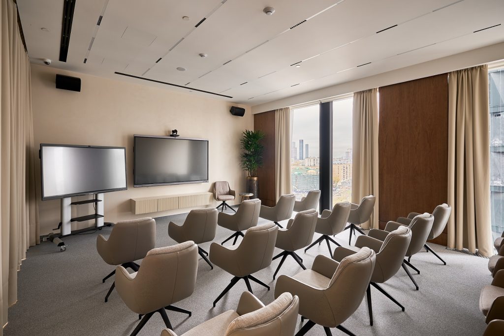 - Дополнительно в переговорных над столами установлены современные подвесные светильники, излучающие мягкий, но достаточный свет, создавая теплую и располагающую обстановку.