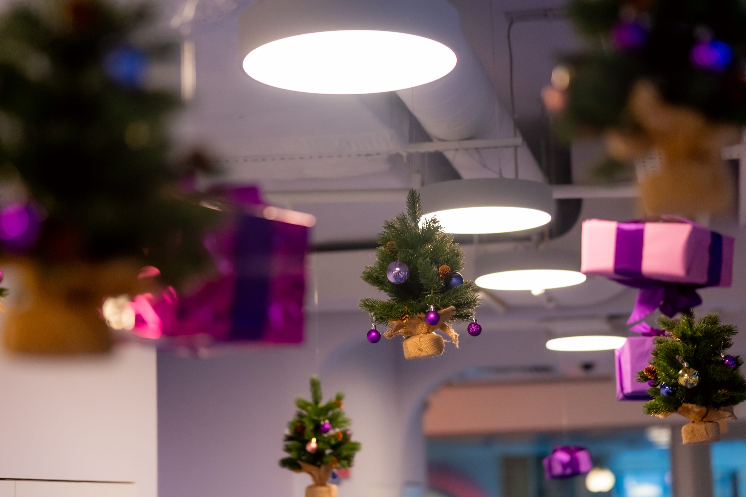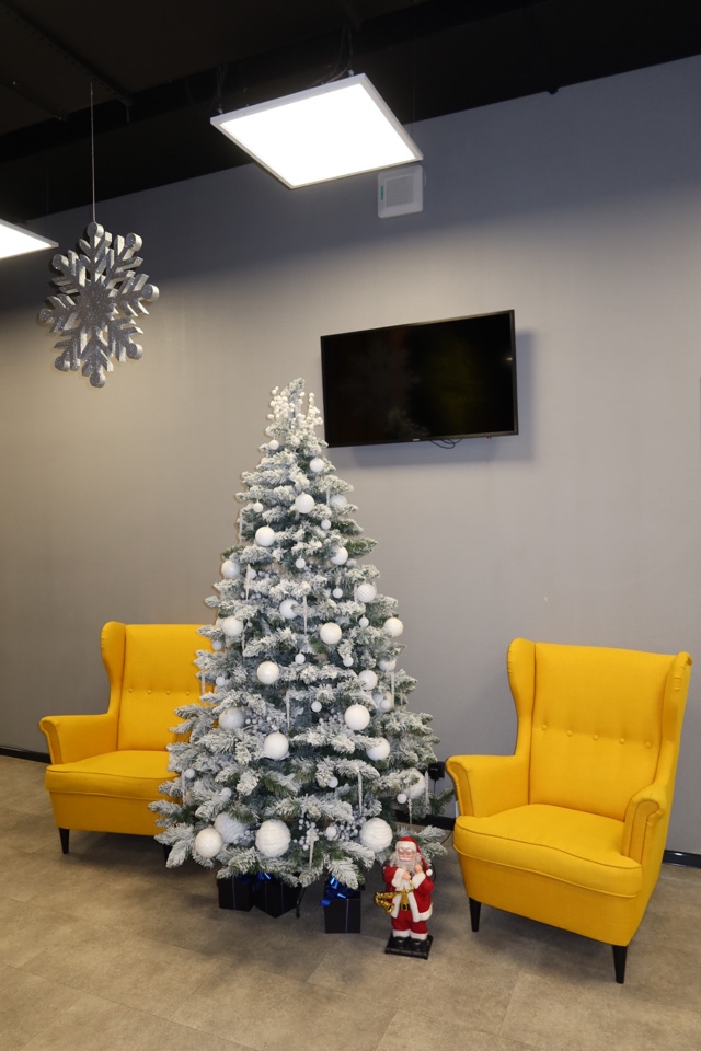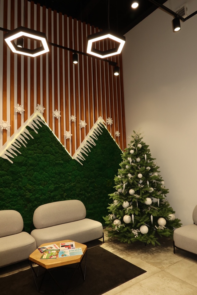 Визуальным продолжением обновленных ценностей компании стало новогоднее оформление офиса : клиентоцентричности, мастерства и командности. Даже ограничения — сложная планировка, открытый потолок, бюджетные рамки — были превращены в часть идеи.