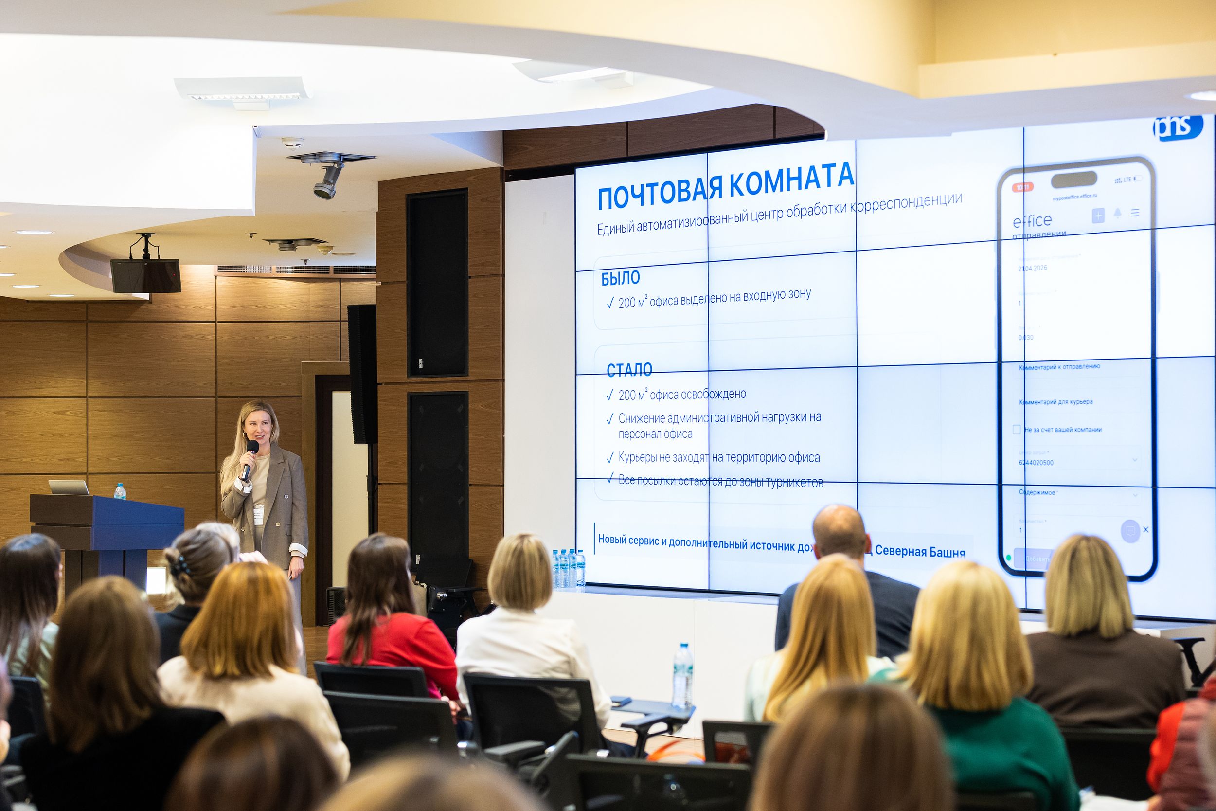 На конкретных кейсах Анастасия показала, как офисные сервисы (почтовая служба и переговорные комнаты для внешних встреч), изначально созданные для внутренних нужд компании, со временем вышли за периметр офиса и стали частью совместного проекта с арендодателем — бизнес-центром «Северная Башня».