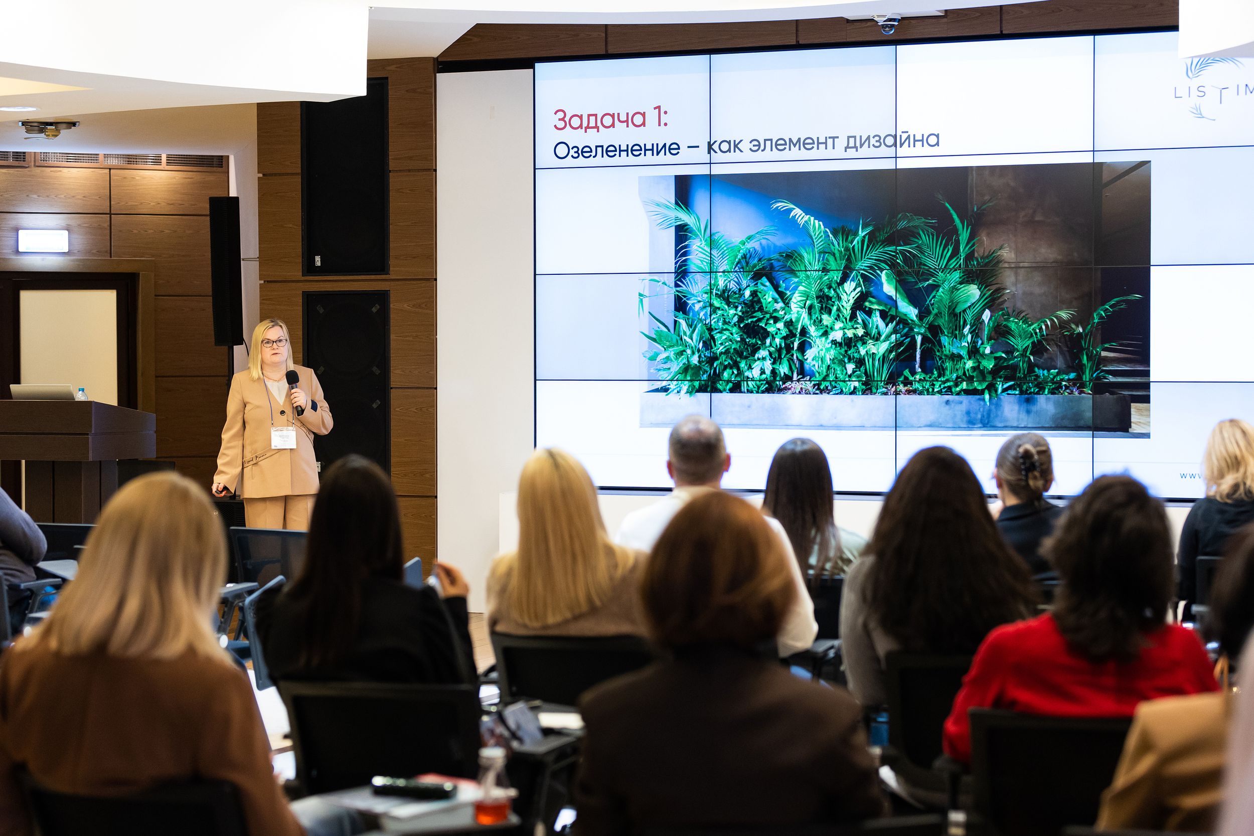 Екатерина Терехова, генеральный директор, Listime, рассмотрела тему озеленения офисных пространств не как декоративного элемента, а как полноценного инструмента формирования среды. В центре доклада был вопрос о роли заказчика в создании эффективного озеленения. Эксперт рассказала о том, как правильно выстроить взаимодействие с поставщиком, при котором зелень в офисе остается живой и здоровой, а не становится источником головной боли клиента.