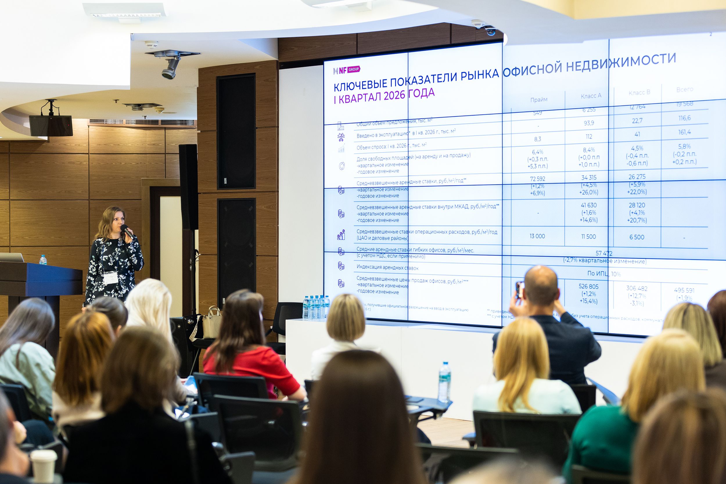 Елена Акатова, директор департамента офисной недвижимости, NF Group, открыла деловую программу докладом о ключевых тенденциях рынка офисной недвижимости. Она рассказала о трендах, ожиданиях арендаторов, какие локации наиболее востребованы, где открываются новые возможности для бизнеса. Елена также представила ключевые показатели прошедшего квартала. Только в первом квартале этого года было введено в эксплуатацию 116,6 тысячи квадратных метров — практически весь новый объем офисов обеспечили классы А и B. Арендные ставки продолжили рост. В классе А средневзвешенная ставка достигла 34 315 руб./м²/год — это плюс 26% к прошлому году. Класс B также подорожал: 26 275 руб./м²/год, рост на 22% в годовом выражении. Прайм-сегмент держится на отметке 72 592 руб./м²/год. Операционные расходы в ЦАО и деловых районах составили: для прайм-сегмента — 13 000 руб./м²/год, для класса А — 11 500 руб./м²/год, для класса B — 6 500 руб./м²/год. Индексация арендных ставок по рынку привязана к ИПЦ и составила в первом квартале 10%.