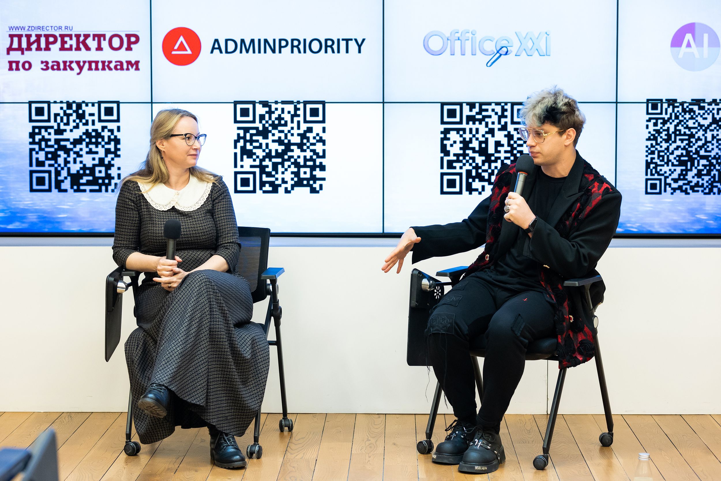 Финальная дискуссия объединила трех практиков с разным опытом и масштабами задач. Татьяна Гавричкина, руководитель направления АХО компании «Иртея» (слева), и Маргарита Шамаева, административный директор Ozon (справа), продолжили тему оптимизации офисных затрат: как сокращать расходы без потери качества — на примере конкретных сервисов, с которыми сталкивается каждая административная команда. В фокусе обсуждения оказались охрана и видеонаблюдение, мониторинг рабочих мест, а также организация корпоративного питания.