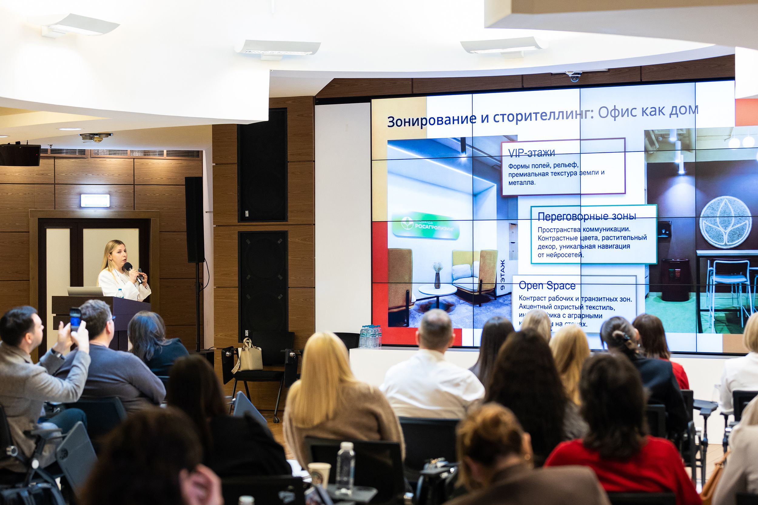 Анастасия Гурьянова, начальник административно-хозяйственного управления, «Росагролизинг», поделилась практическим опытом создания корпоративной штаб-квартиры. В своем докладе она рассмотрела полный цикл: от формирования концепции и работы с ограничениями конкретного объекта до поиска нестандартных архитектурных и инженерных решений.