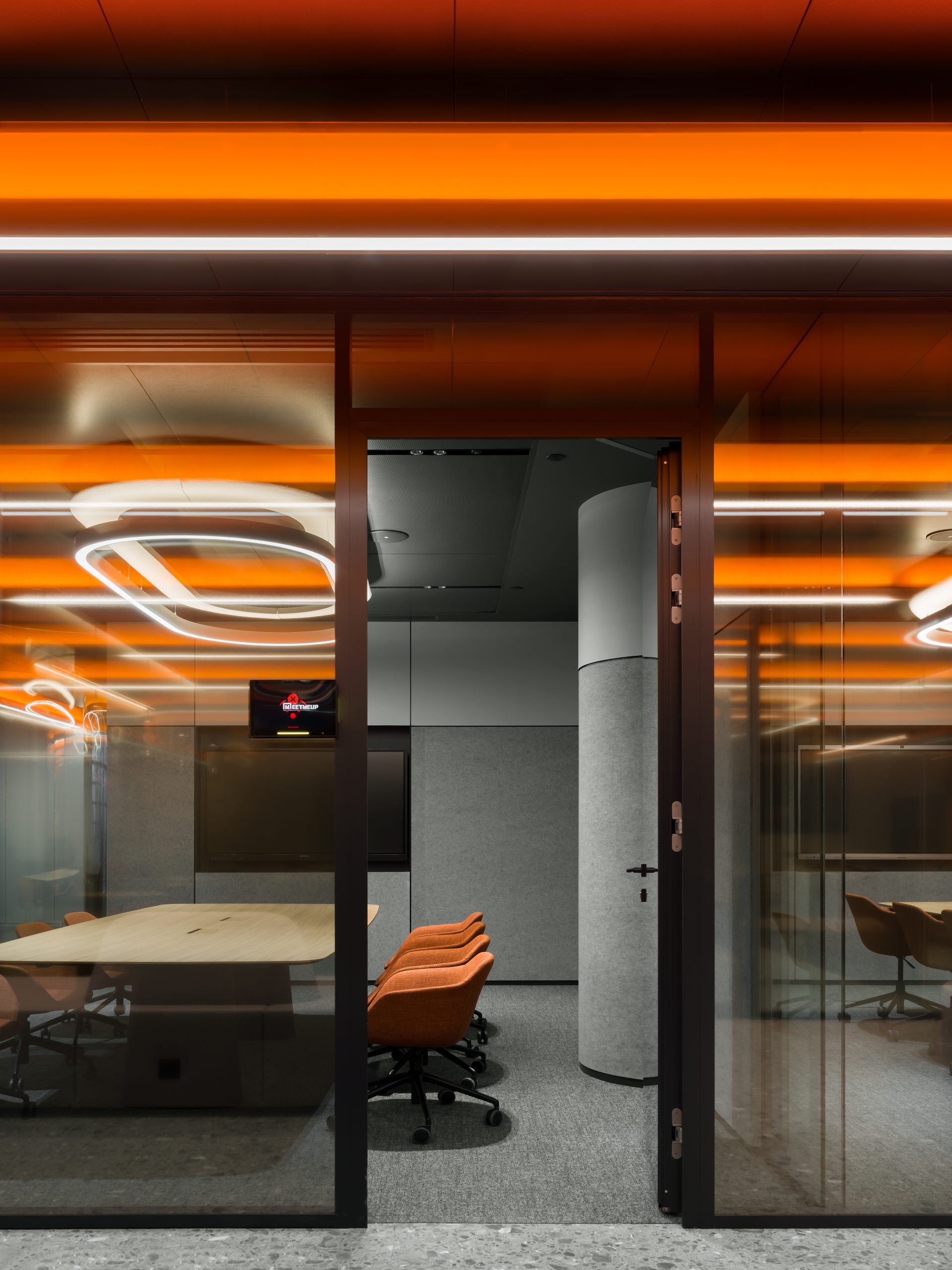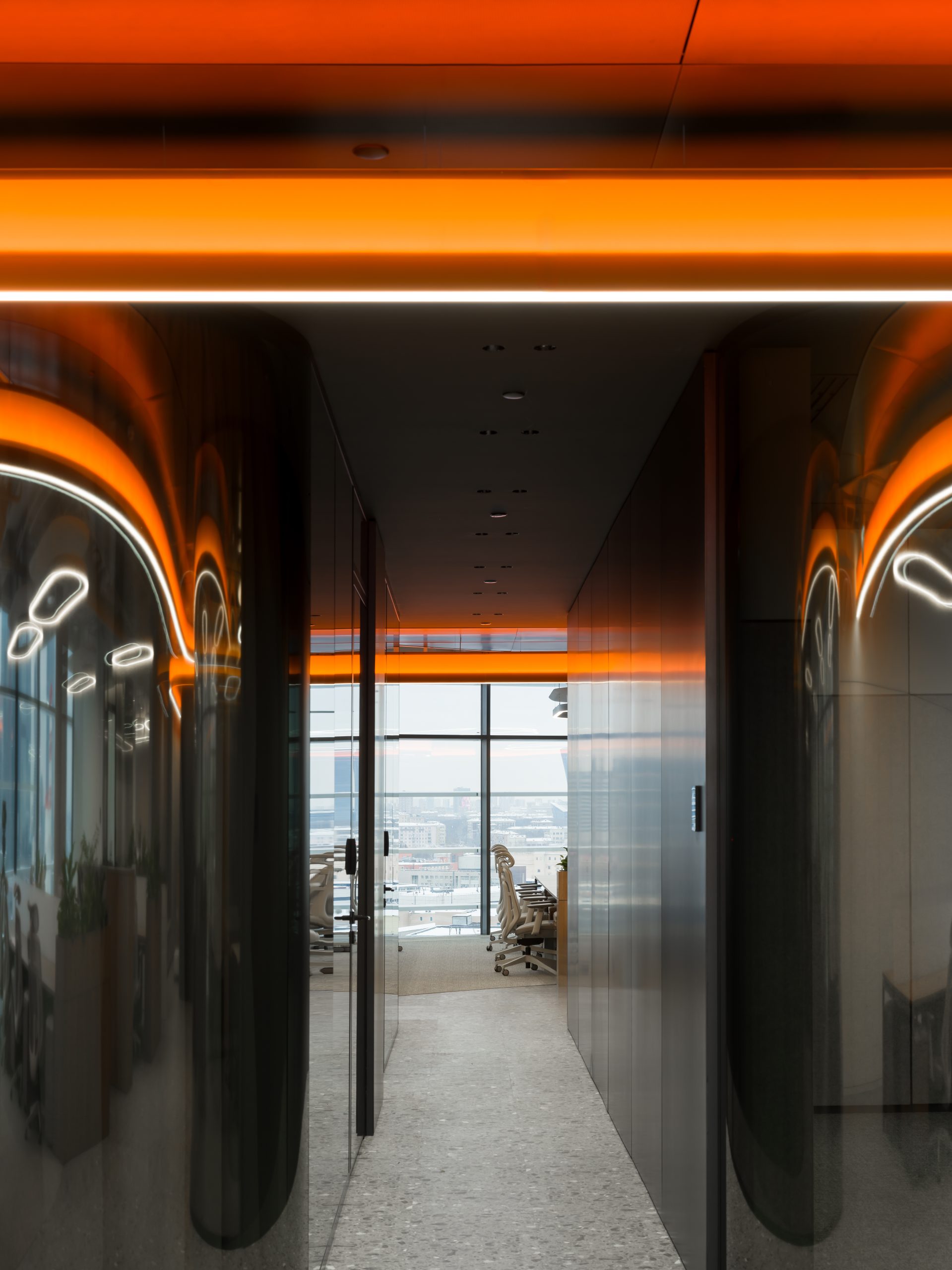 Офис транслирует такие ценности заказчика, как устойчивость, технологичность и амбиции. Динамика света и внимание к деталям создают визуальное напряжение, которое остается в памяти посетителей.