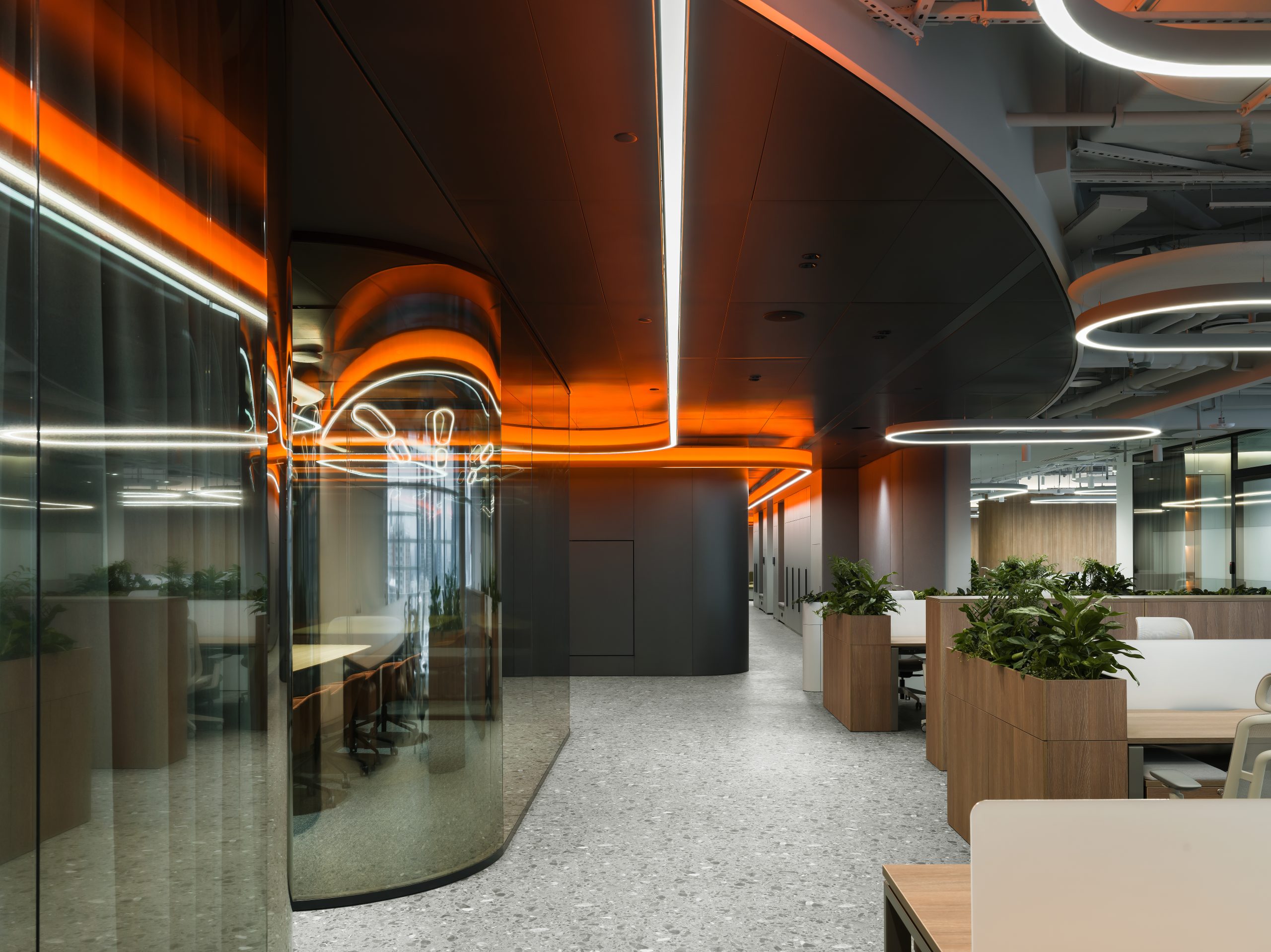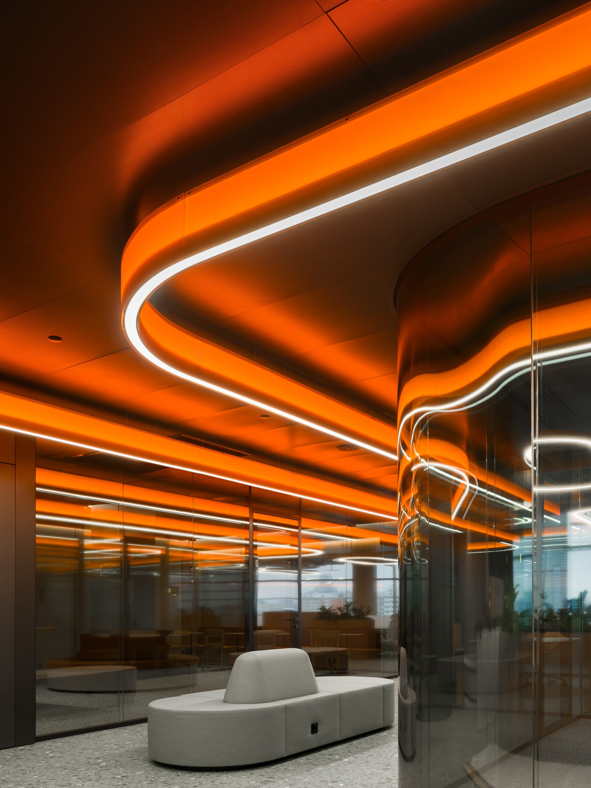 В основе концепции лежит световой путь, вдохновленный огнями транспортных магистралей, который проходит через интерьер, создавая доминанту и контрастируя с более темным ядром офисного пространства.
