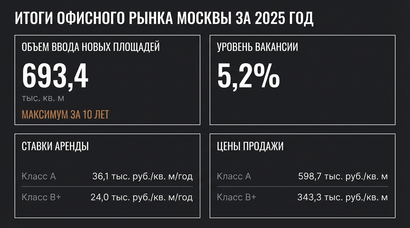 В 2025 году московский офисный рынок сделал вид, что растет, и почти поверил в это сам. Девелоперы ввели 693,4 тыс. кв. м — максимум за последние десять лет. Пользователи же в это время предпочли не двигаться. Они остались там, где были. Или аккуратно пересогласовали условия.