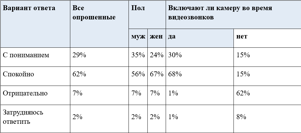 Онлайн-встречи стали привычным явлением. Каждая десятая компания требует, чтобы все сотрудники присутствовали на них с включенными камерами. Опрос работающих россиян, проведенный SuperJob и МТС Линк показал, что с пониманием к подобному требованию относятся 29% респондентов, спокойно — еще 62%. В 12% организаций правило включать видео распространяется только на отдельные службы — по усмотрению руководителей.